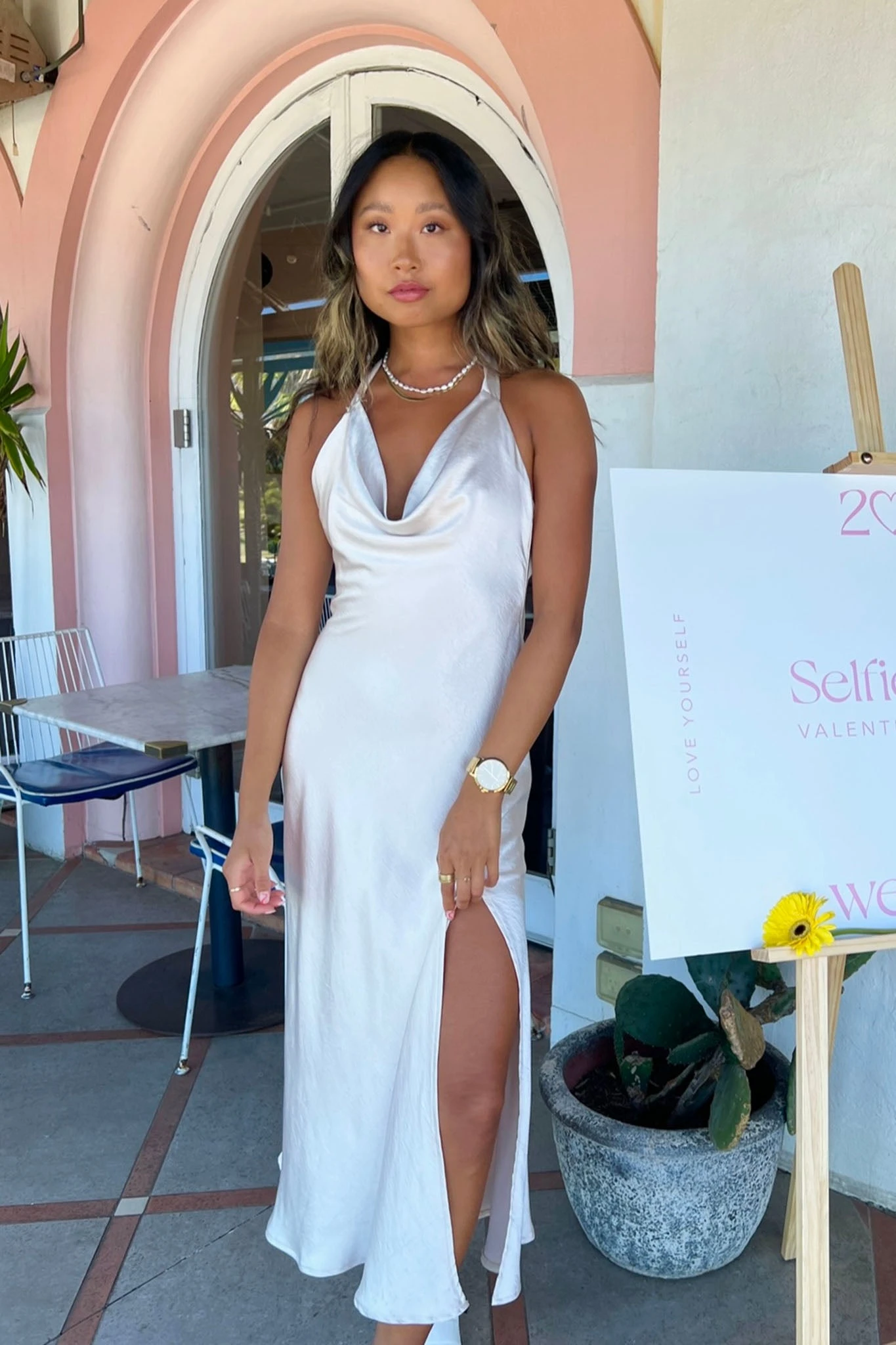 Steal the spotlight in our gorgeous Champagne Showers dress. We are loving the on-trend cowl neckline and flattering halterneck style. Perfect for a wedding or Summer nights at your fave rooftop bar. Team it with nude heels and a small purse for an ultra chic look.