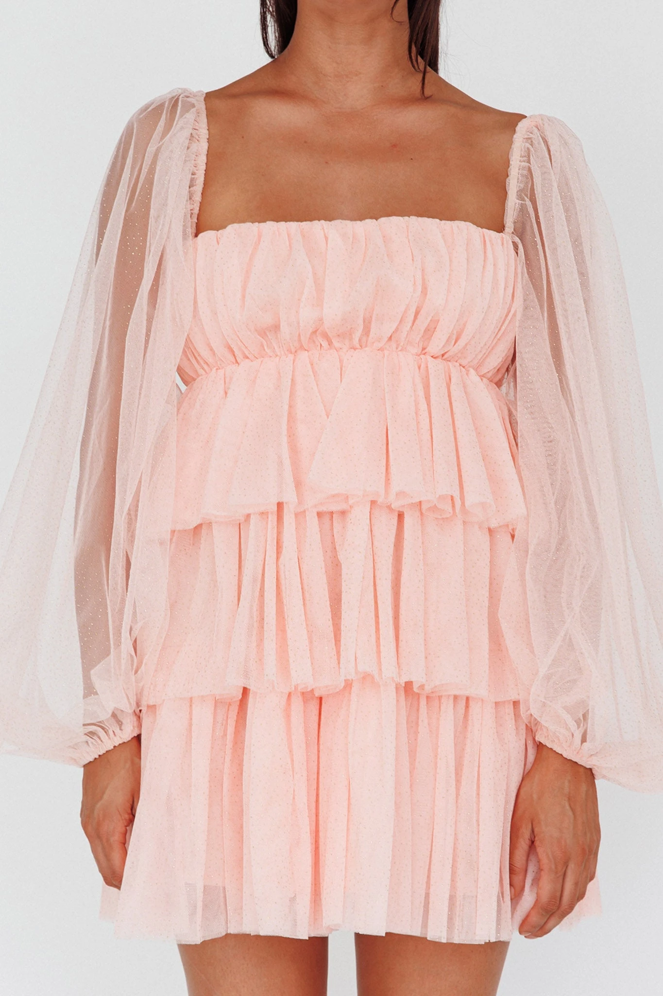 Good morning, angel! We have fallen in love with our Spring Morning mini dress. Featuring sheer, long sleeves and tiered ruffles throughout. It’s perfect for a wedding or birthday celebration. Team it with tie-up heels and a clutch.