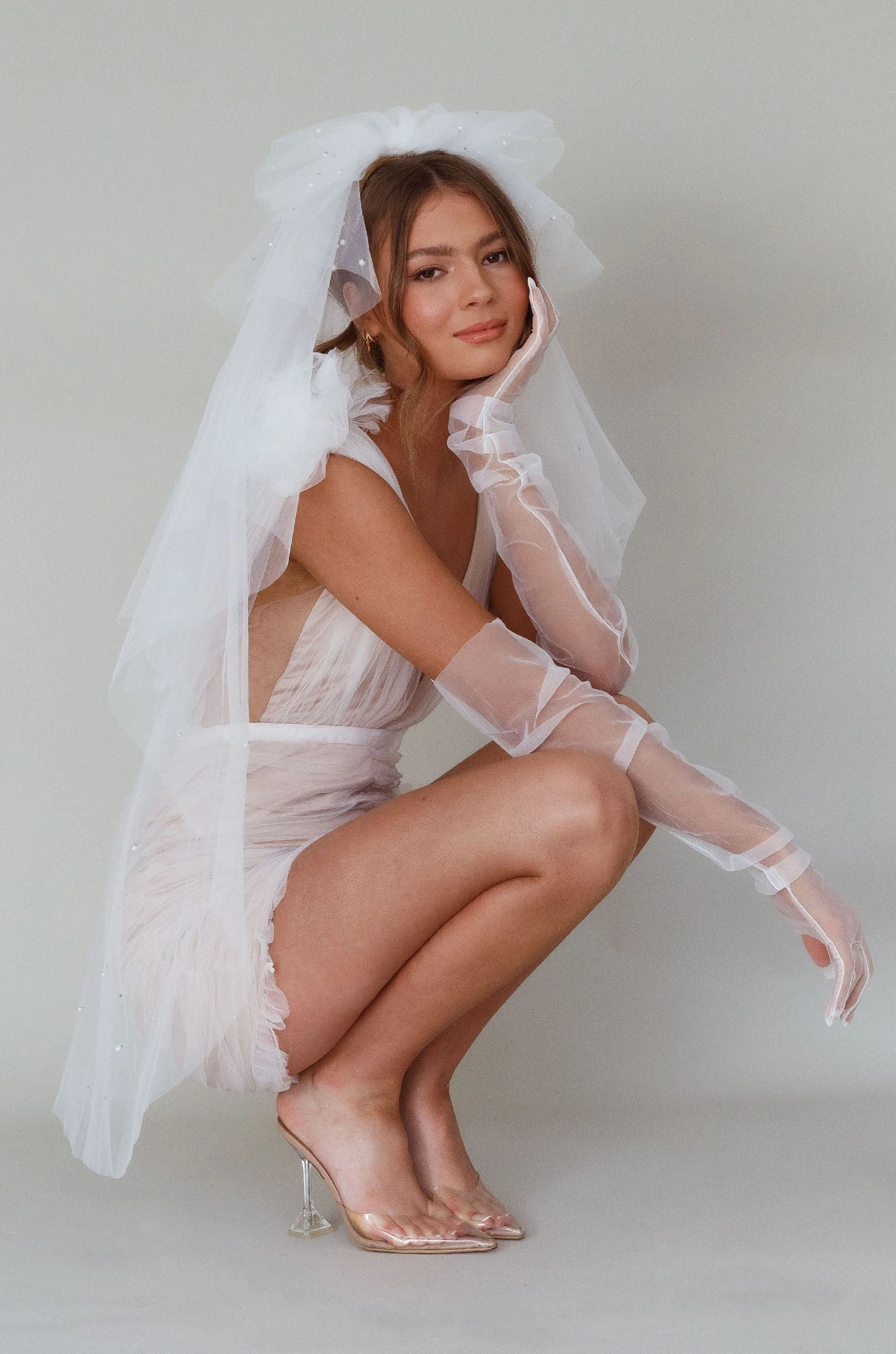 Make beautiful memories in our stunning Unforgettable veil. Featuring a silver comb for fastening and pearl embellishment, we’re head over heels! Team it with our Only You bridal gloves for an unforgettable look!