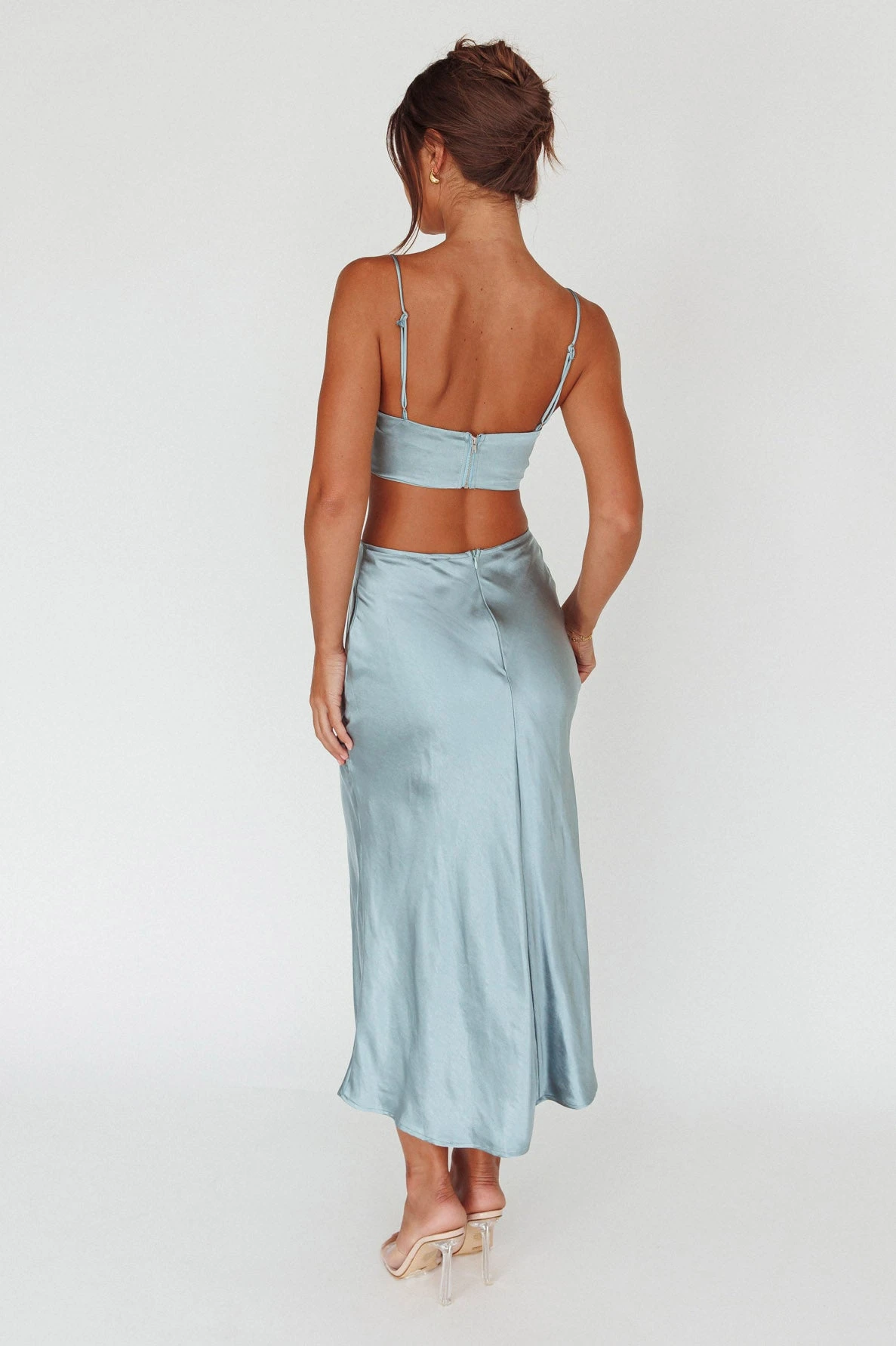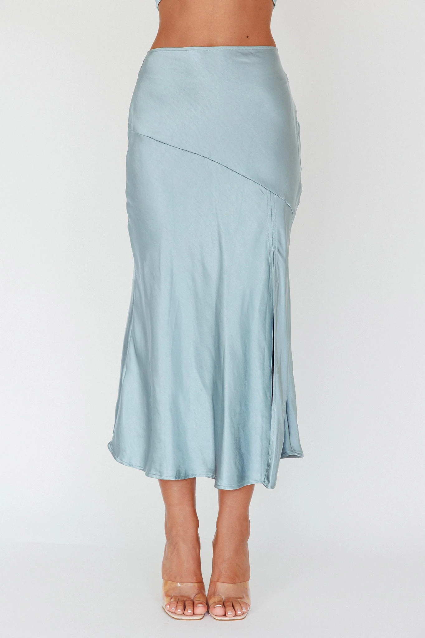 You will turn heads in our gorgeous Well Versed midi skirt. We are obsessed with that front thigh split and soft, satin fabric. Perfect for romantic date nights with bae teamed with its matching crop top and tan, strappy heels.